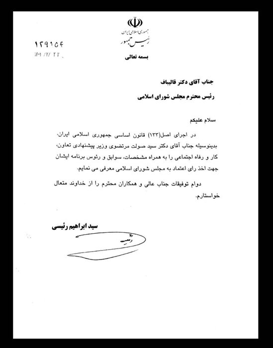 به گزارش تهران بهشت؛ «سید محمد حسینی» اعلام کرد: آیتالله «سید ابراهیم رئیسی» رئیسجمهور در نامهای به «محمدباقر قالیباف» رئیس مجلس شورای اسلامی، «سید صولت مرتضوی» را بهعنوان وزیر پیشنهادی کار معرفی کرد.